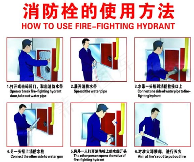 消防栓:打开箱门,接好水带,开启阀门灭火。