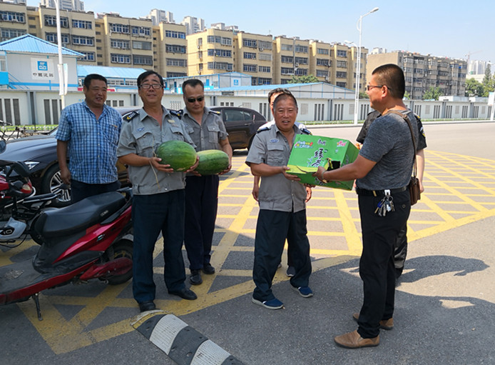 为保障学校暑期校园安全,在近期我市连续高温的情况下,保卫一线的工作人员仍然在酷暑中坚守岗位。7月19日上午,保卫处李彭处长代表学院领导,前往校大门看望慰问坚守岗位的保卫一线人员,并叮嘱大家在做好工作的同时,要注意防暑降温多喝水,确保安全。同时为工作人员送去了精心准备的消暑降温用品,希望大家在辛勤工作的同时劳逸结合,保重身体。