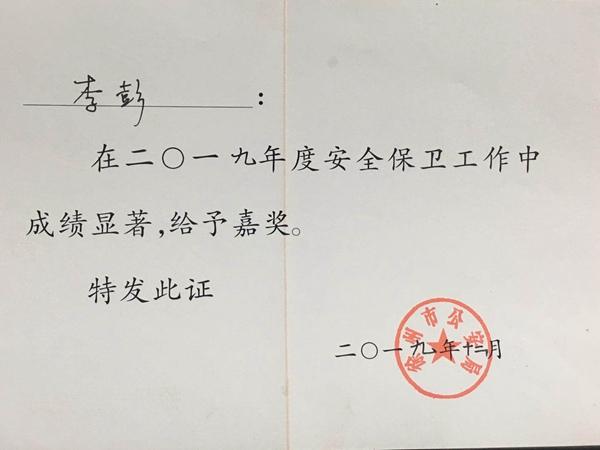 我院被徐州市公安局评选为“2019年度徐州市内保工作先进集体”,李彭同志被评选为“2019年度徐州市内保先进个人”。