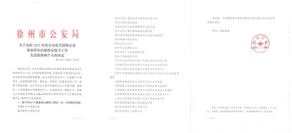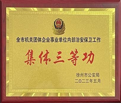 徐州市公安局 “关于表彰2022年度全市机关团体企业事业单位内部治安保卫工作先进集体和个人的决定” (徐公局[2023]115号)文件,给予我校安全保卫处记集体三等功一次。